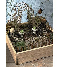 I have made several indoor and outdoor fairy gardens and each is unique. They seem to take on a life of their own. They are something that we create that represents a get away. A peaceful place away from everyday life. A fantasy. It is gardening in miniature. A dwarf curry plant turns into a bush. A rosemary topiary becomes a large tree to sit under in your ornate lounge chair and a few snips are an excellent addition to tonight's dinner. Moss is a lush green carpeted floor and is easy to keep alive with a few sprays of water. Fairy vine climbs an ornate arbor and compliments tiny succulents in clay urns.
